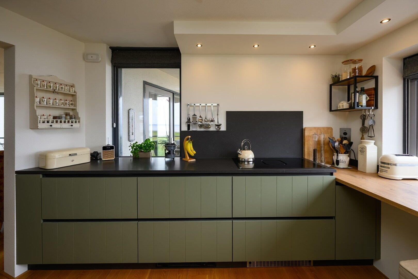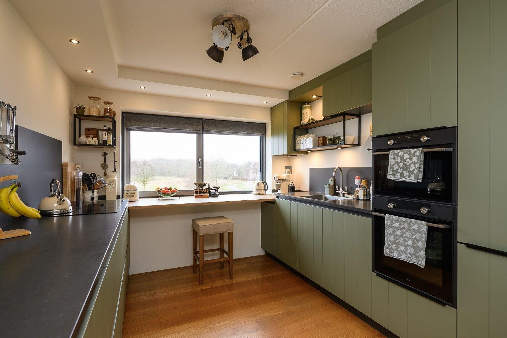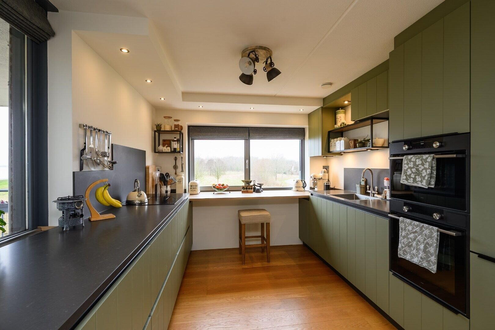 De luxe Bruynzeel inbouwkeuken is voorzien van veel bergruimte en hoogwaardige inbouwapparatuur, waaronder een Atag inductiekookplaat met geïntegreerde afzuiging. Bij het keukenraam op het westen bevindt zich de eetbar: een fijne plek voor de ochtendkrant en het ontbijt, met uitzicht op de wolkenluchten, vogels en het leven in het omliggende wetland, waar regelmatig ook kleine zoogdieren zoals reeën te zien zijn. In de avond vormt het uitzicht over het Gooimeer een prachtig decor bij een goed glas wijn.