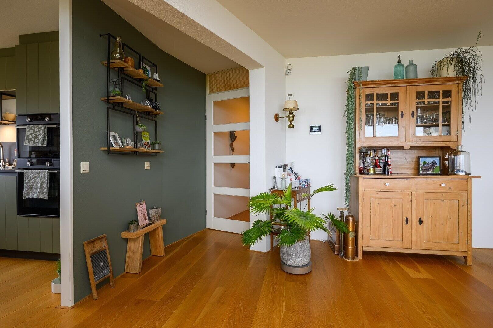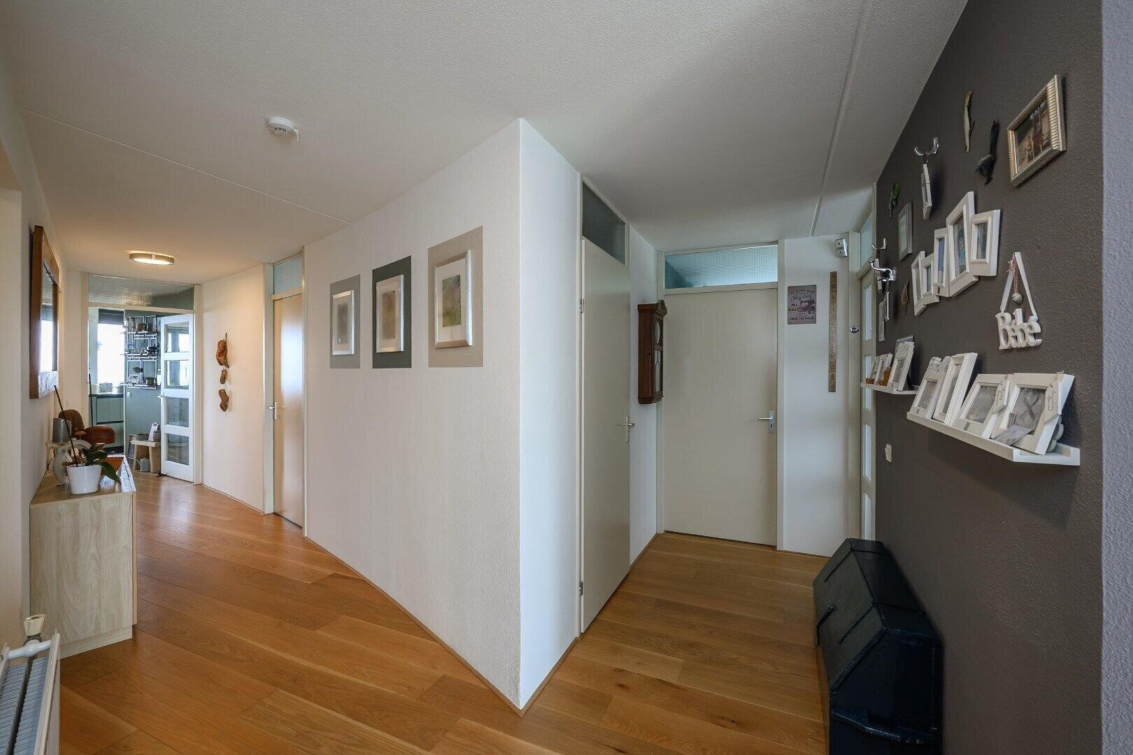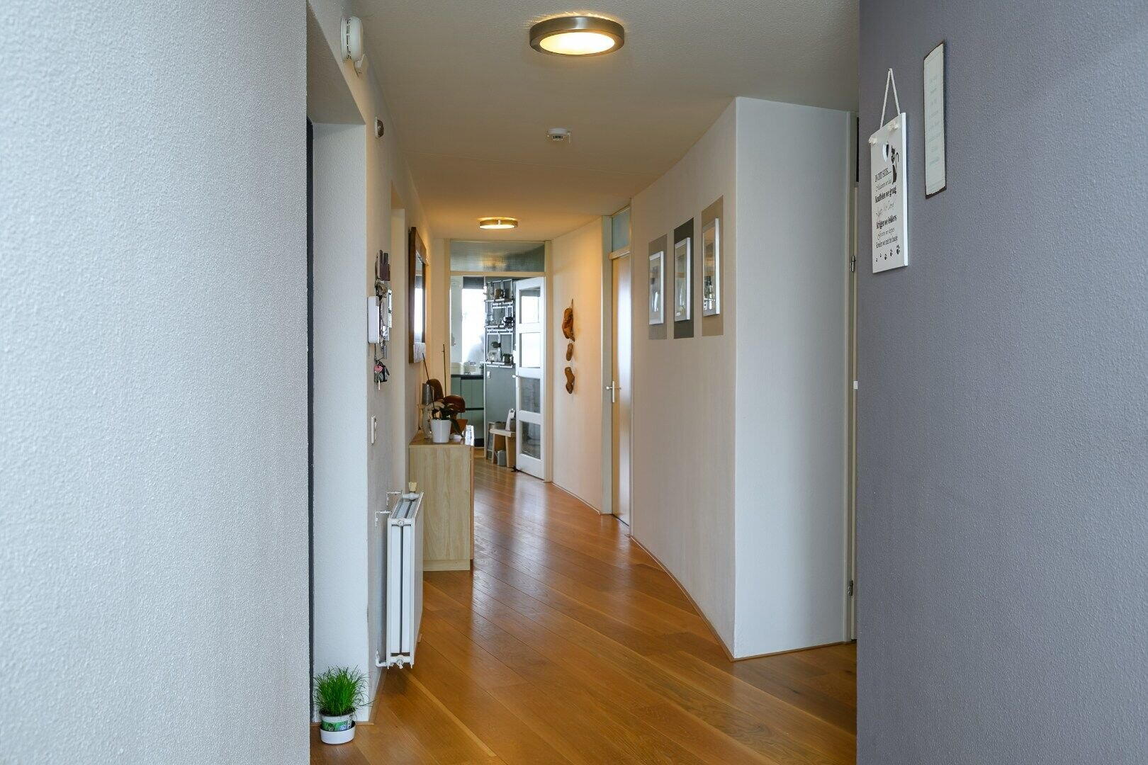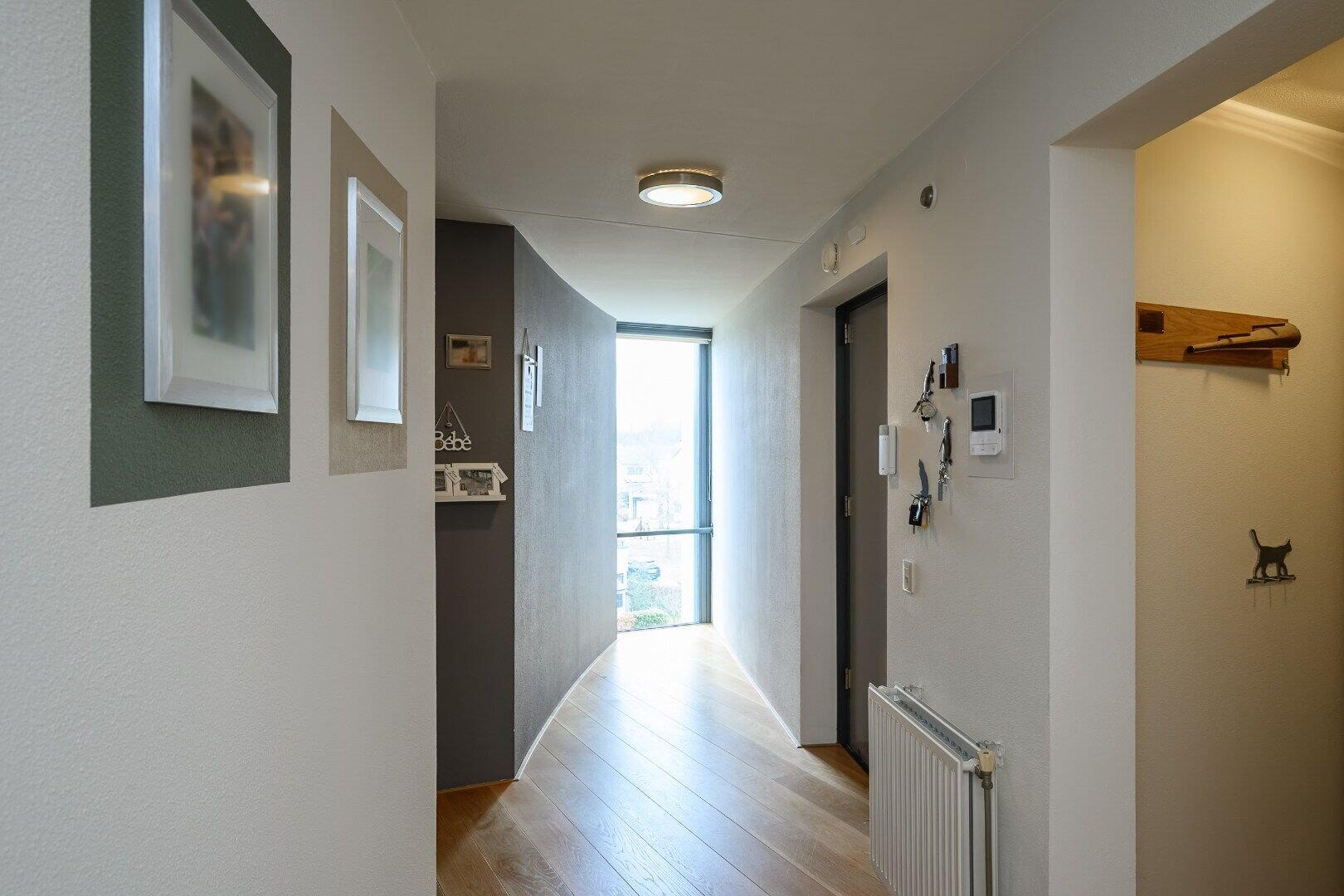 Via de voordeur komt u in het privégedeelte van het appartement. Deze speels vormgegeven, licht afgeronde hal geeft toegang tot de woonkamer, keuken, slaapkamers, badkamer, het separate toilet en de inpandige berging/wasruimte.