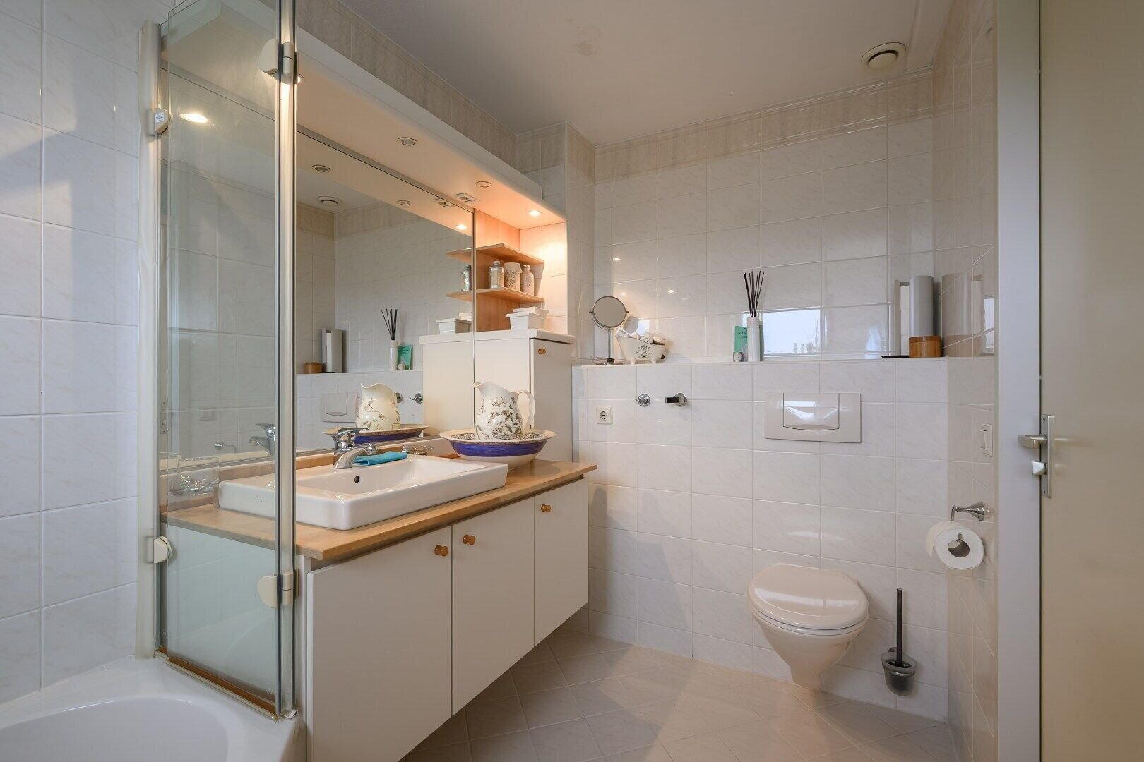 Het appartement beschikt over drie volwaardige slaapkamers en twee badkamers. De master bedroom heeft directe toegang tot een badkamer met ligbad, wastafel en wandtoilet. De tweede badkamer is uitgerust met een douche en wastafel. Voor gasten is een separaat toilet.